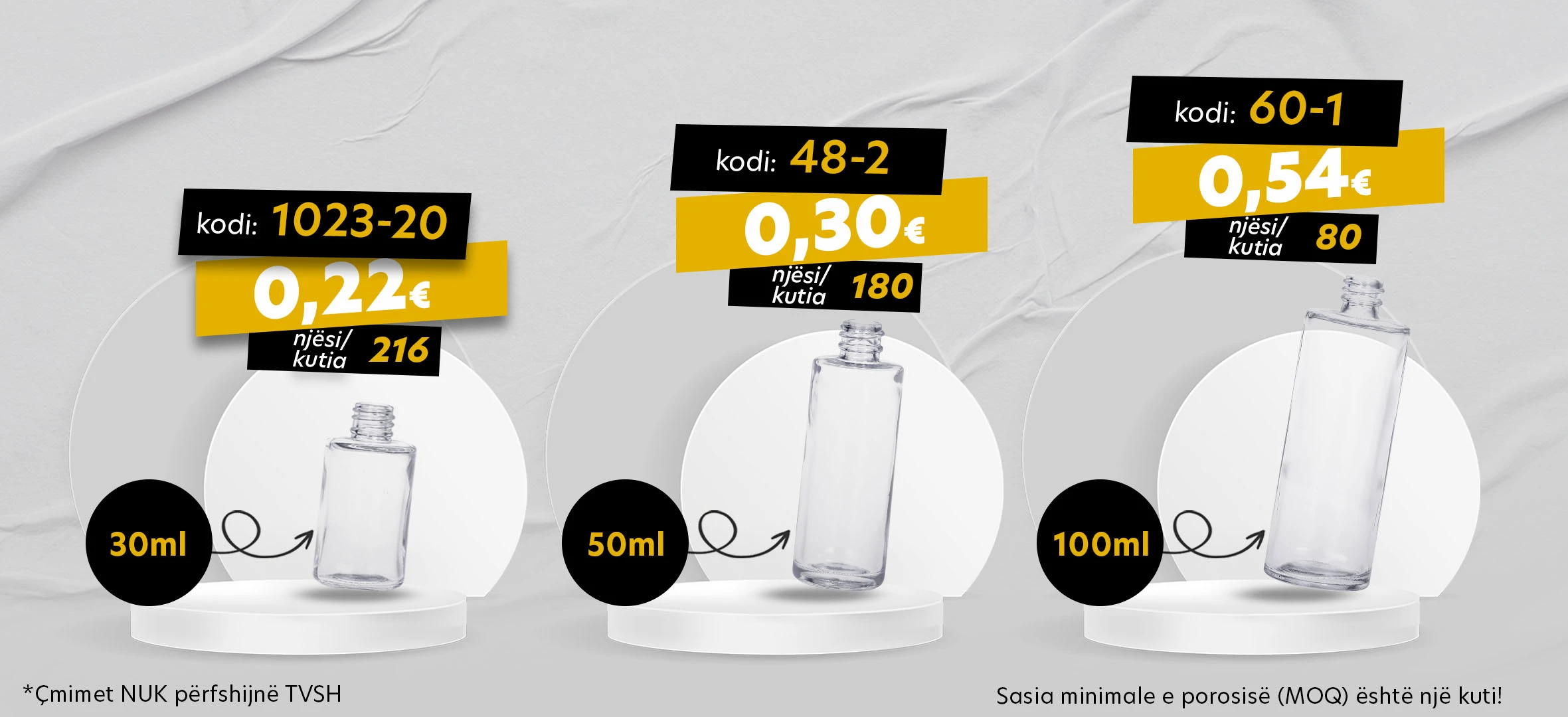Zbuloni në vaza.gr të gjithë artikujt e nevojshëm të pajisjeve për parfumëri për të organizuar, pajisur dhe nxjerrë në pah produktet tuaja në mënyrë profesionale. Në koleksionin tonë do të gjeni shishe dhe gota parfumi në forma dhe madhësi të ndryshme, si dhe shishe qelqi, kristali, crimp ose shishe për aromat e ambientit dhe makinës. Ne gjithashtu.. -